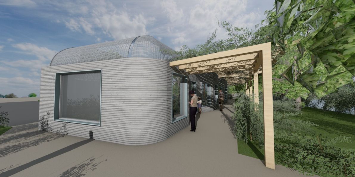 Les grandes vitres permettent aux visiteuses et aux visiteurs de voir à l'intérieur du bâtiment.